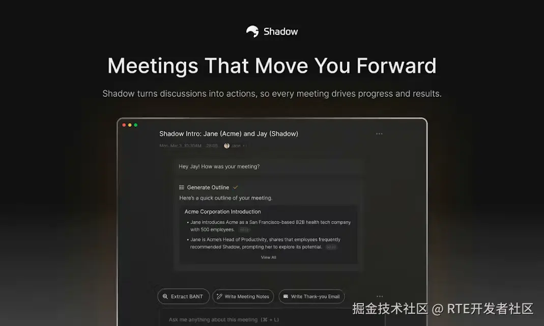 Shadow 是一款无须机器人介入的 AI 会议助手,实现会议转录、任务分配与执行追踪一体化。