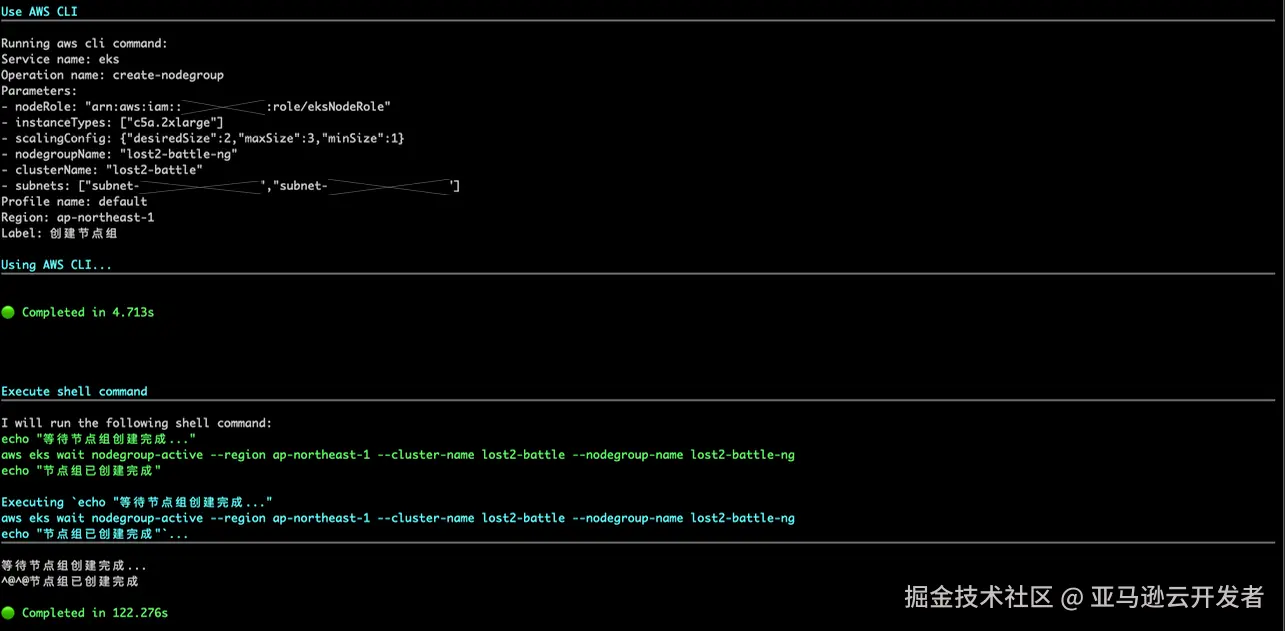 在生成 EKS 集群创建命令时,CLI 根据开发人员使用自然语言描述的 EKS 版本和亚马逊云科技区域选择合适的参数,无需开发人员查阅文档即可完成任务,并且这一过程是全自动的。