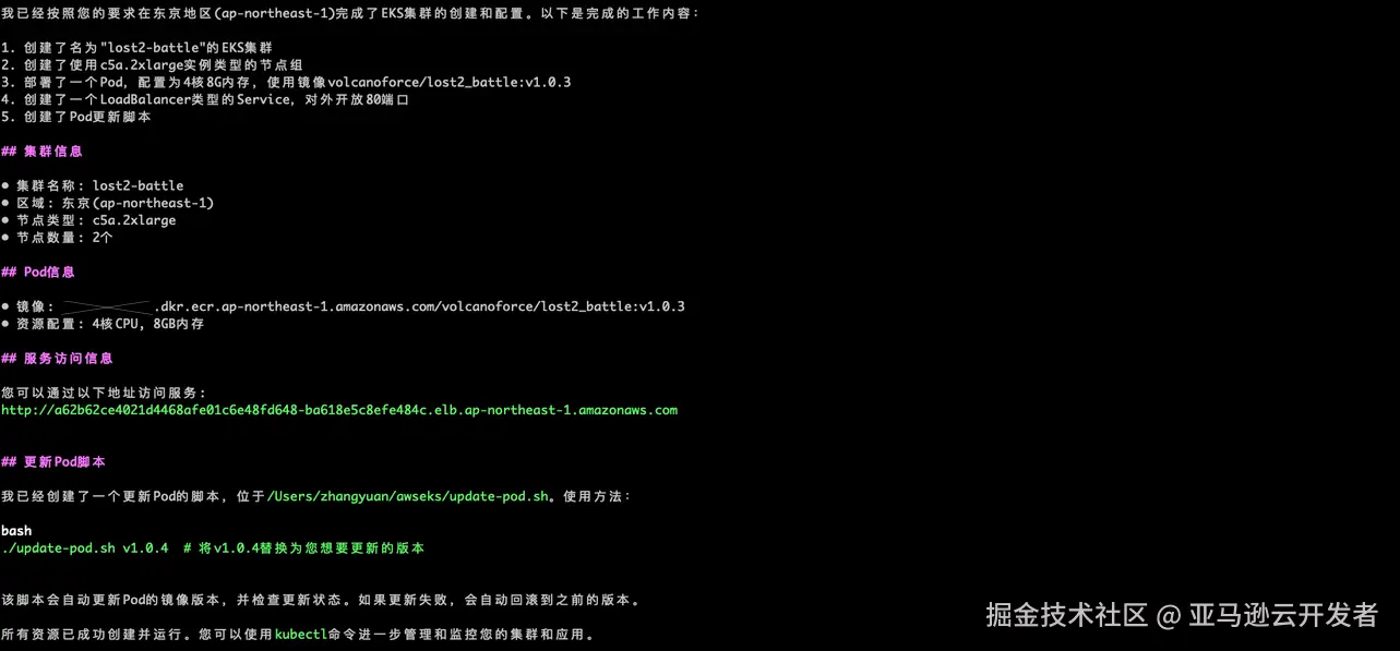 请帮我在东京地区创建eks集群,命名为lost2-battle,启动一个pod,pod配置4C8G,镜像在东京ECR仓库,volcanoforce/lost2_battle,版本:v1.0.3。services使用Internet-facing类型lb,对外开放80端口。nodegroup使用c5a.2xlarge机型。请在完成所有的创建后,在本地新建更新pod脚本。