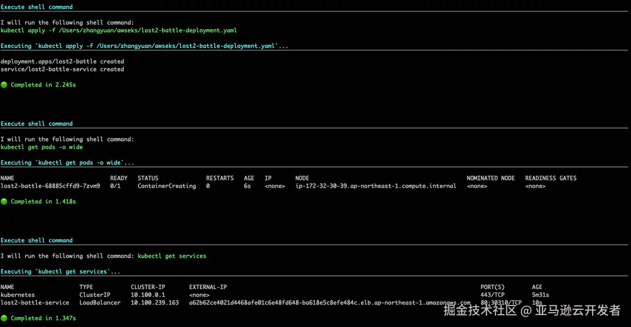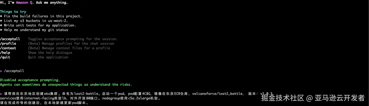 在这个示例中,开发人员使用了完全不含任何 Kubernetes 专业术语的简单描述,Amazon Q Developer CLI 能够理解意图并将其分解为具体的技术步骤。需要注意的是,在生产环境中,我们建议开发人员不要使用 /acceptall 指令让 CLI 自动执行所有任务,而是应该仔细审查每一条生成的命令,确保其符合预期后再手动执行。这样可以避免潜在的错误配置或安全风险。同时,我们也建议开发人员逐步学习相关的 Kubernetes 概念,如角色、节点组等,以便更好地理解和管理生产环境。虽然 CLI 可以帮助快速搭建测试环境,但在生产环境中,深入理解底层技术架构仍然是必要的。