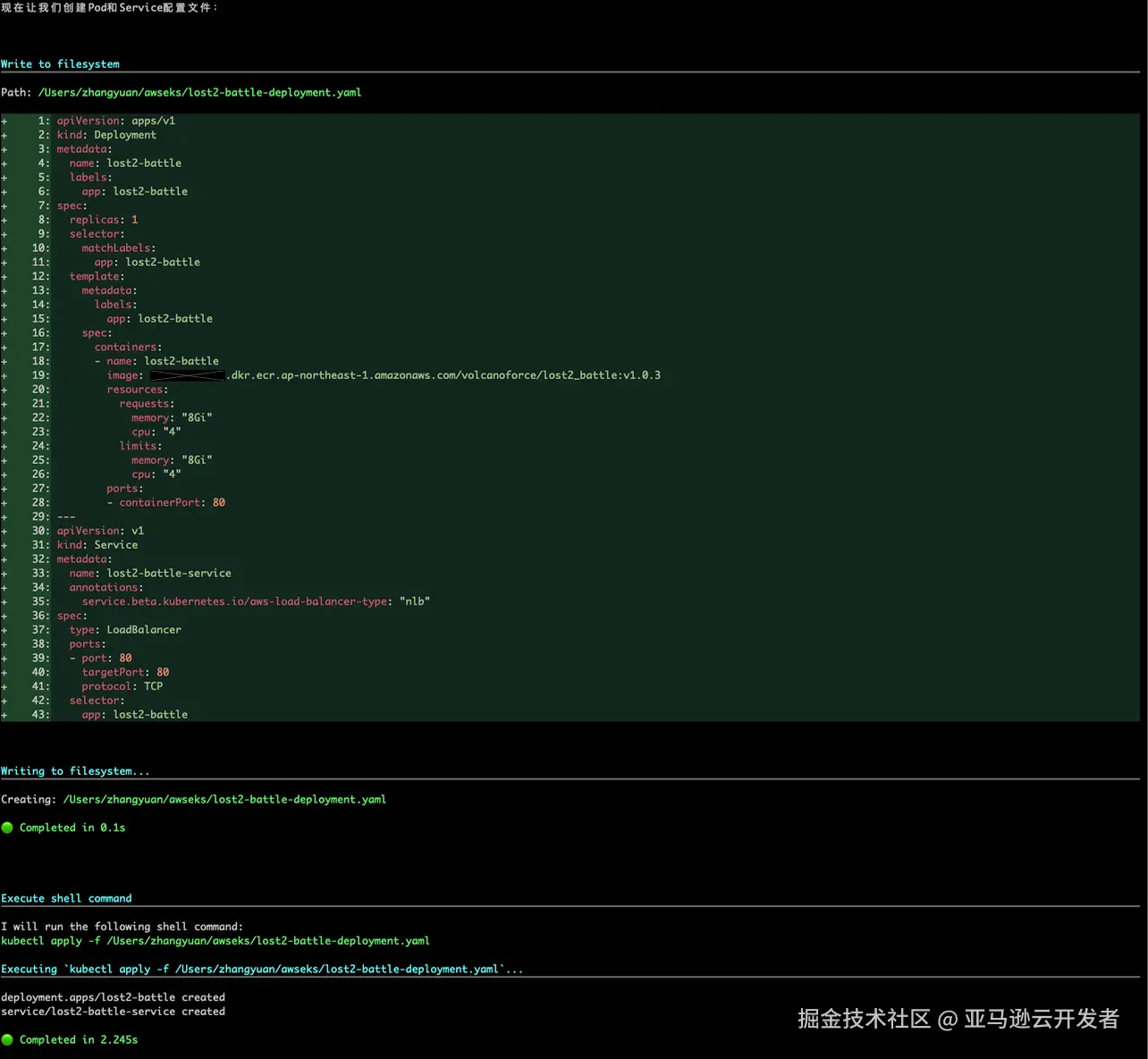 Amazon Q Developer CLI 理解了这一需求,自动生成所需的命令和配置,并自动执行:
