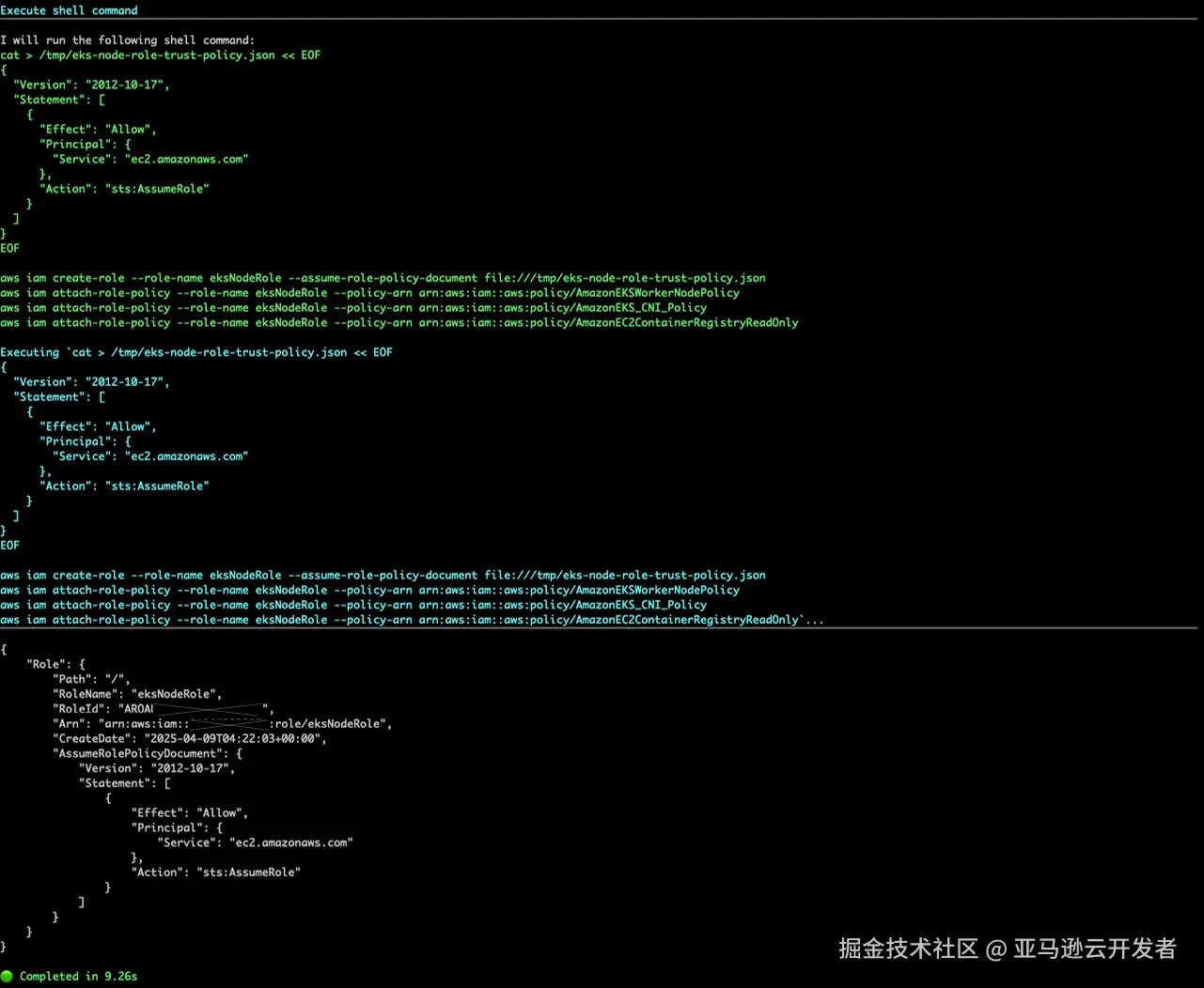 节点组角色的创建通常需要理解复杂的 Amazon IAM 政策和权限系统。CLI 自动生成了所需的策略附加命令,并且自动执行。
