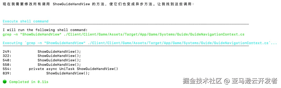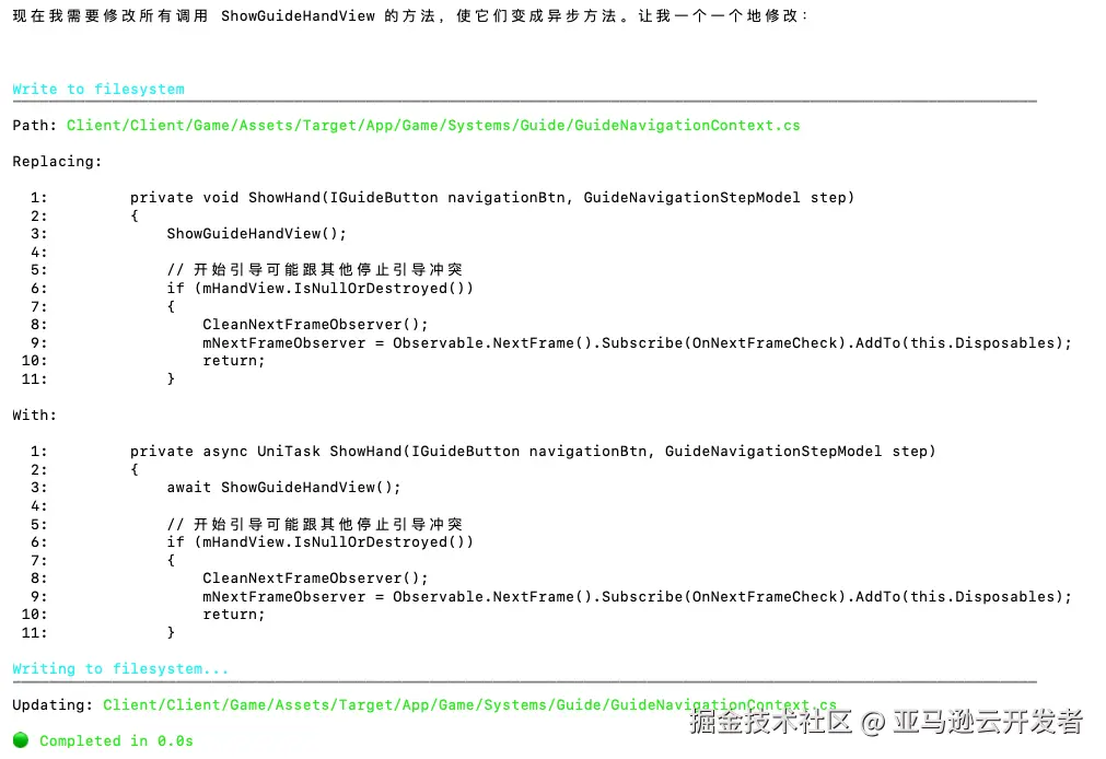接下来,Amazon Q Developer CLI 完成了对所有调用代码的调整,下图为其中一个示例: