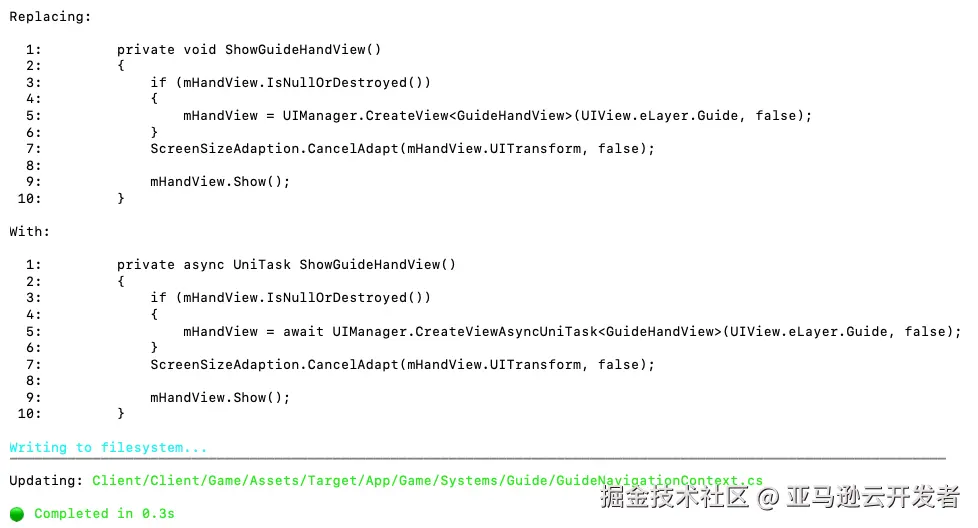 原力棱镜的某款热门游戏需要接入微信小程序生态以扩展用户群体,但面临微信小程序 30MB 包体限制的挑战。团队需要将数百 MB 的游戏资源放到 CDN 上通过异步形式加载,因此需要将大量 C# 代码由同步调用改为异步调用。这种转换通常是一项耗时且容易出错的任务。