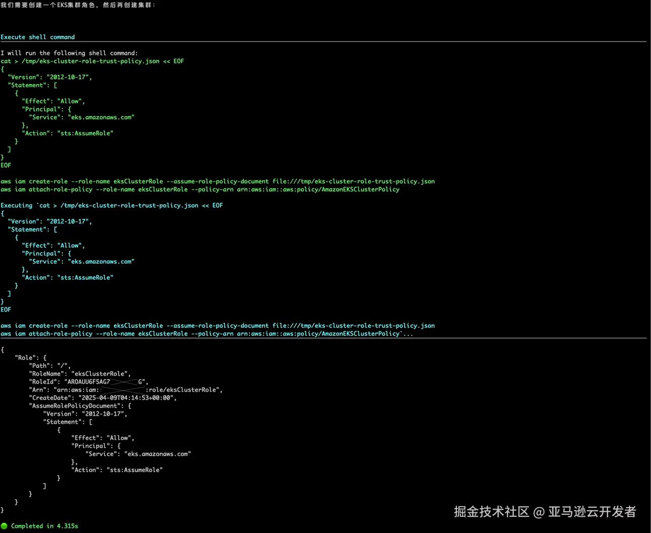 在这一步中,CLI 自动识别出创建 EKS 集群的前置条件是需要一个具有正确权限的 IAM 角色。