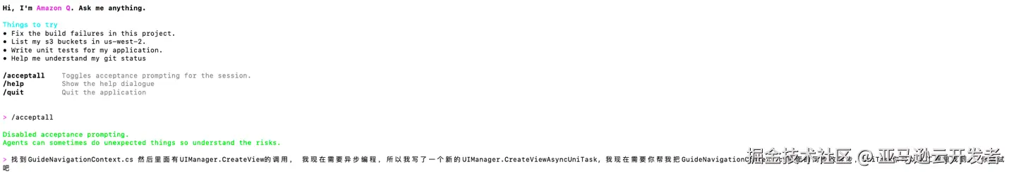 - 审核生成的代码和命令:特别是在生产环境中,始终检查 Amazon Q Developer CLI 生成的内容。切勿在生产环境中使用 /acceptall 指令自动执行所有命令,而应当逐条审核确认,特别是对于可能影响生产服务或产生不可逆转更改的操作。