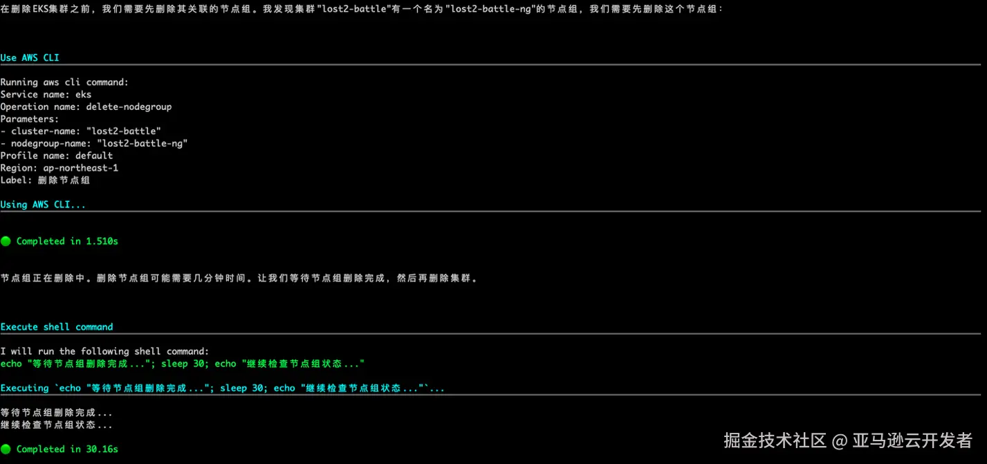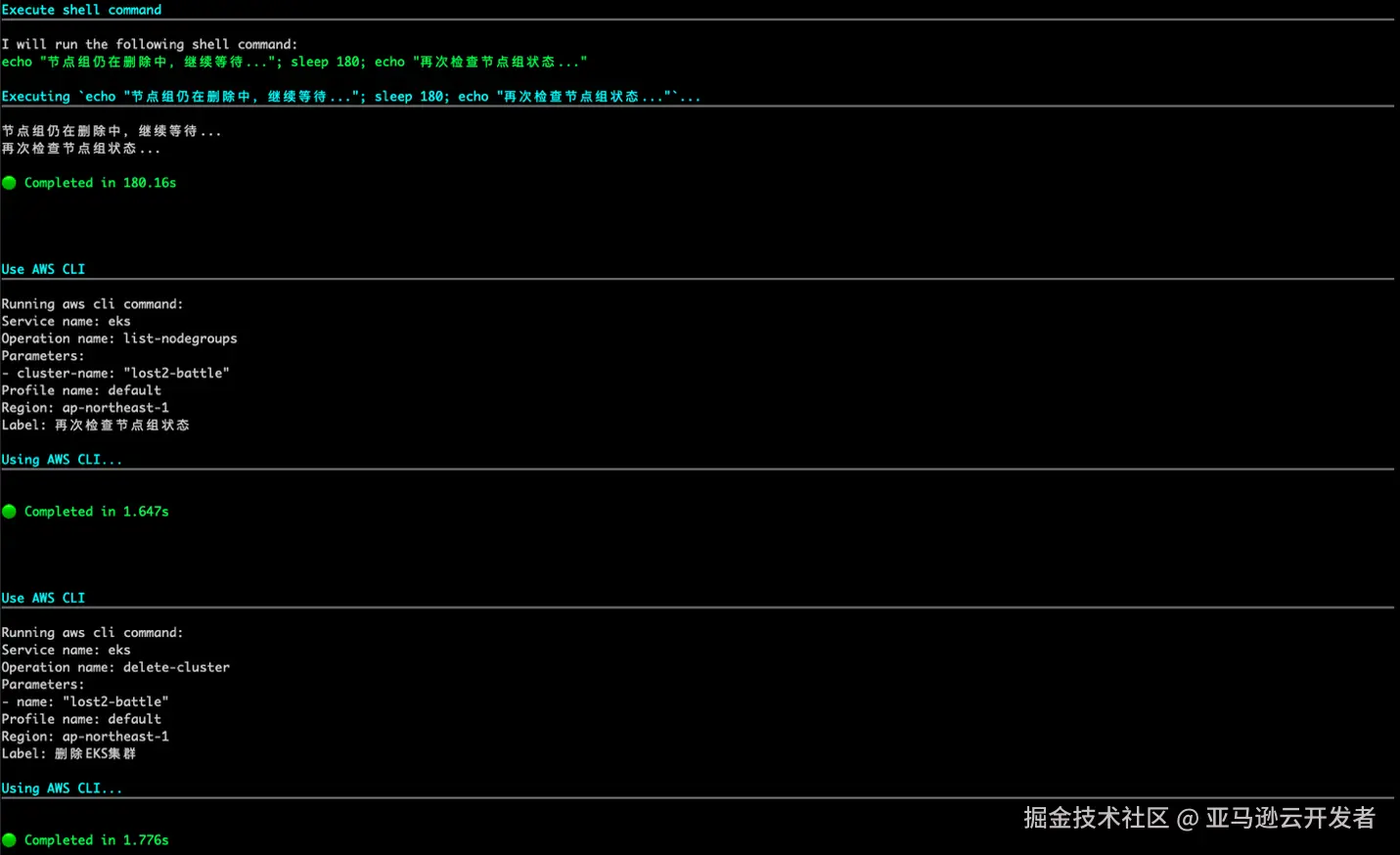 开发人员只需使用简单的自然语言请求删除集群,无需知道 EKS 资源之间的依赖关系和正确的删除顺序,这些复杂性由 CLI 自动处理。