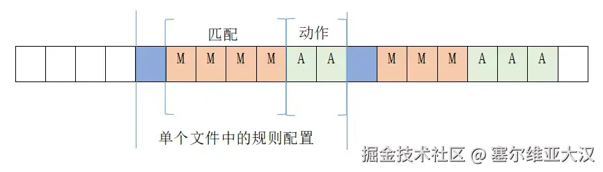 udevd 启动时会遍历预定的目录,寻找规则配置文件。udevd 逐个解析每个规则配置文件,形成一个规则项的数组。单个配置文件解析得到的规则项是按序连续排列的,其中第一项(如下图的蓝色项)记录了一些从相应规则配置文件解析得到的规则项的信息,包括规则项的个数等。从该配置文件解析得到的规则项紧接着按规则的类型顺序排列。这些规则项可分为两类,一类用来做匹配,另一类指示执行的动作。如下图所示: