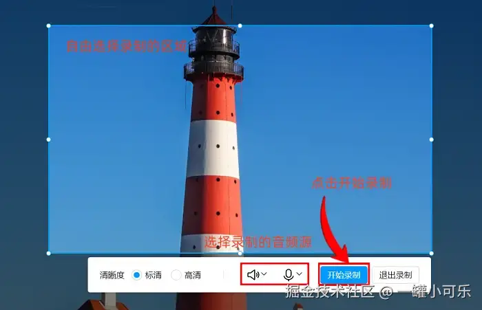 步骤2:进入录制页面后,就能自由选择录制区域了。还能选择音频来源,是录系统声音,还是麦克风声音,或者两个都录?都可以按照实际的需求选择哦!如果你想给视频增加水印,就点击 “图片水印” 进行设置。全部设置好后,点击 “开始录制” 就会开始录制视频啦。