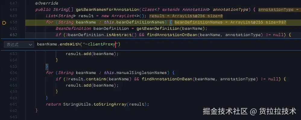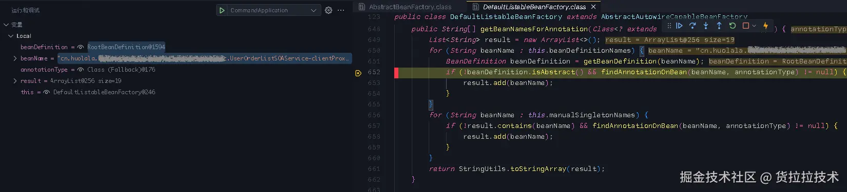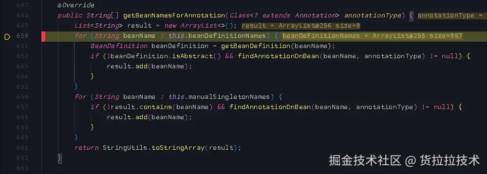 随后在第 38 行,遍历这些 Bean 名称,并使用