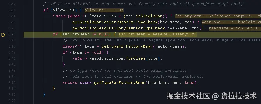| 7 | AbstractAutowireCapableBeanFactory#getTypeForFactoryBean() | 此时,如果指定 beanName 的 Bean 实例已经存在,则返回该实例。否则,会执行初始化逻辑,如。 图 28 根据前面代码 Debugging 了解到的信息,当 beanName 是另外一个还未创建的ReferenceBean 实例时,会执行以下这条调用路径:> allowInit[true] |