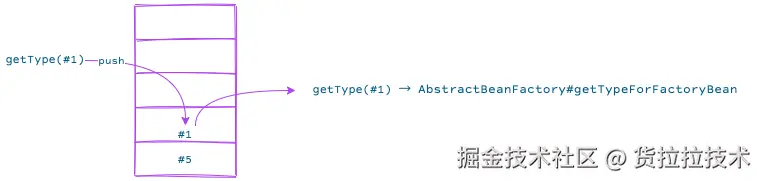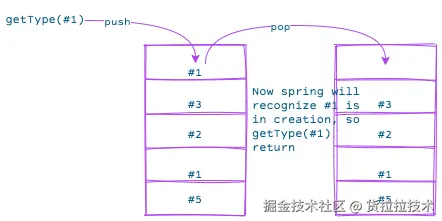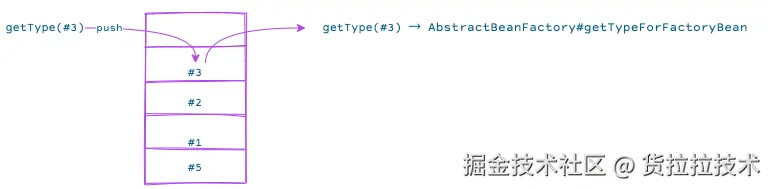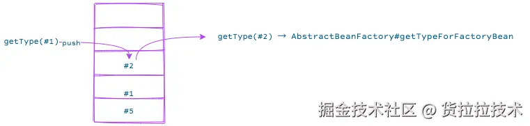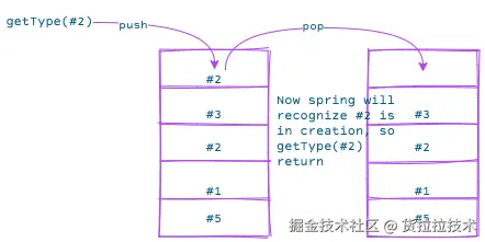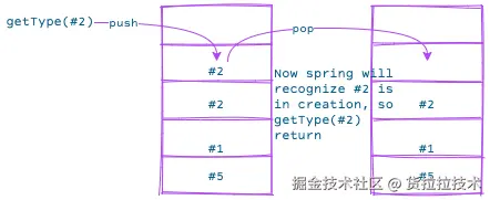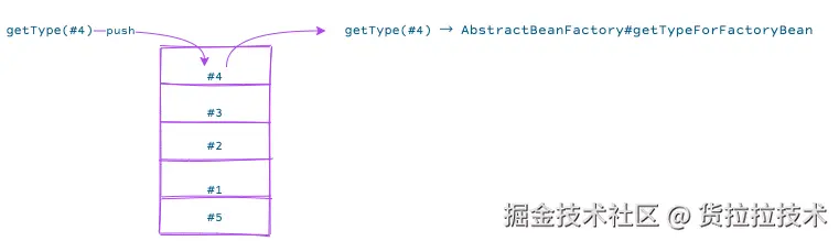 | 2 | 根据 beanDefinitionNames 的元素顺序,A 首先被遍历到,并执行 getType(A)。根据前面的假设,A 是已经实例化过的 bean,因此 getType(A) 将直接返回这个 Bean 实例。从栈的视角来看,getType(A) 调用的上下文先被压入栈中,又随着 getType(A) 调用 return,这些上下文被 pop 出栈。栈又回到了图 29 所示的状态。 | ||