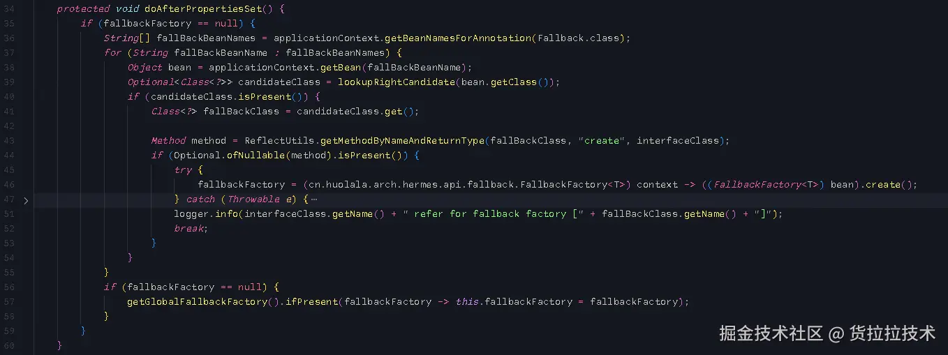 @Fallback注解标注的一系列FallbackFactory类型的实例(即 Spring Bean)。在这段代码中,就是从 Spring Context 中找到所有带该注解的 Bean 的名称,并在后面的代码中创建 fallback bean,赋值给ReferenceBean实例的fallbackFactory字段。
