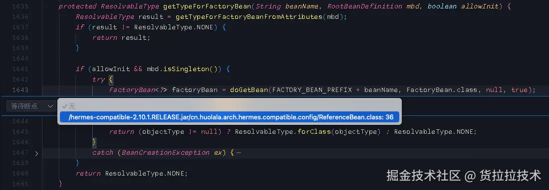 后者(AbstractBeanFactory.java:1643)是实际递归调用的位置。设置断点是为了确认调试时是否实际发生了递归调用。不过由于这是 Spring 框架内部的代码,即便不是在创建 ReferenceBean 实例时也有可能执行到该方法,这可能会干扰调试。为了解决触发时机的问题,可以使用 “添加触发的断点-等待断点” 的技巧。