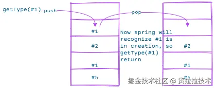 | 7 | 又遍历到了 #1。此时,第 4 步(表格中,序号 4 标注的行)开始的 “#1 的实例化” 还没有结束。Spring 能够识别到 “创建中” 的 bean,并避免重复创建。因此,在这里 getType(#1) 将 return,不会再次触发 doGetBean(#1) 递归调用。 | ||