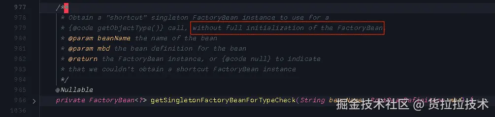 super就是AbstractBeanFactory,因此AbstractBeanFactory#getTypeForFactoryBean()被调用。 | | 8 |AbstractBeanFactory#getTypeForFactoryBean()| 该方法又会调用AbstractBeanFactory#doGetBean(),导致递归调用。 |