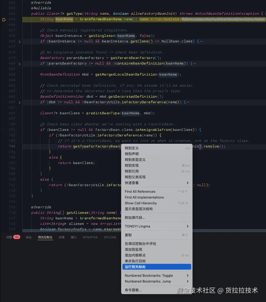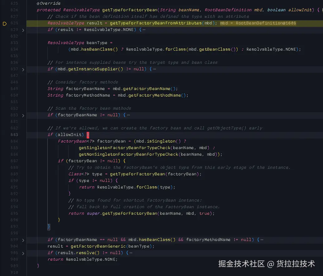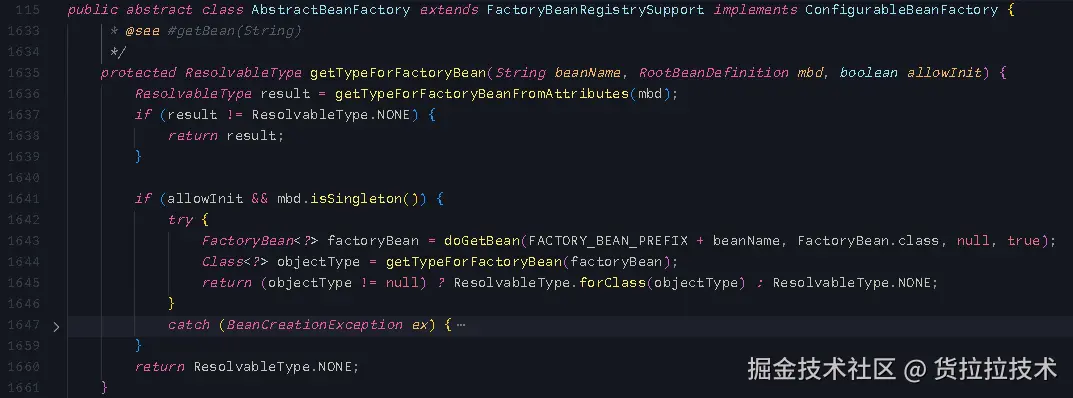 为了进一步确认是递归调用,我们需要验证 getTypeForFactoryBean 方法确实调用了 doGetBean 方法。根据栈信息,我们找到 AbstractBeanFactory.java 文件的第 1643 行,发现正是这行代码调用了 doGetBean 方法,如所示。