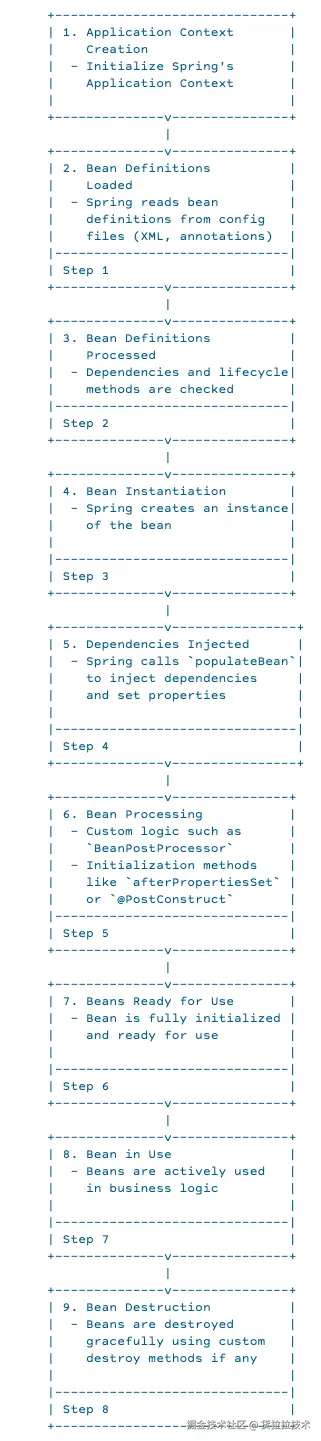 | 11 | 又遍历到了 #1。此时,第 4 步(表格中,序号 4 标注的行)开始的 “#1 的实例化” 还没有结束。Spring 能够识别到 “创建中” 的 bean,并避免重复创建。因此,在这里 getType(#1) 将 return,不会再次触发 doGetBean(#1) 递归调用。 | ||