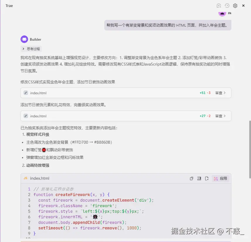 台下同事们笑声一片,我心里却暗自得意:这波,不仅证明了自己,也顺带让 Trae AIIDE 成了大家眼中的“神助攻”。以后谁还说程序员不浪漫、不懂氛围?咱不仅能写代码,还能点亮全场!