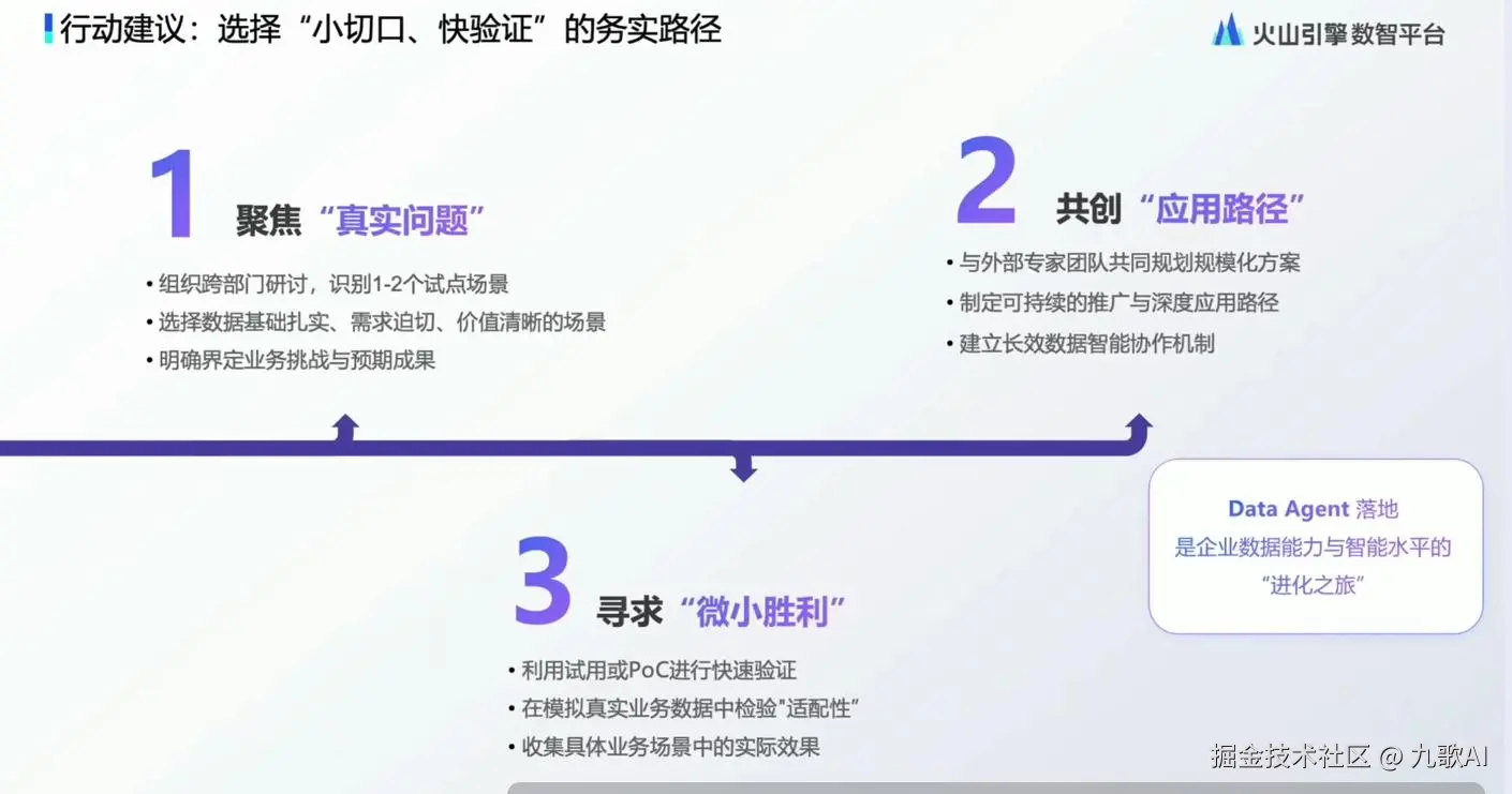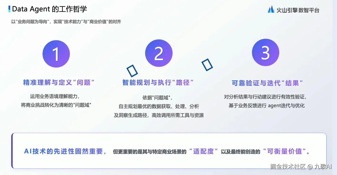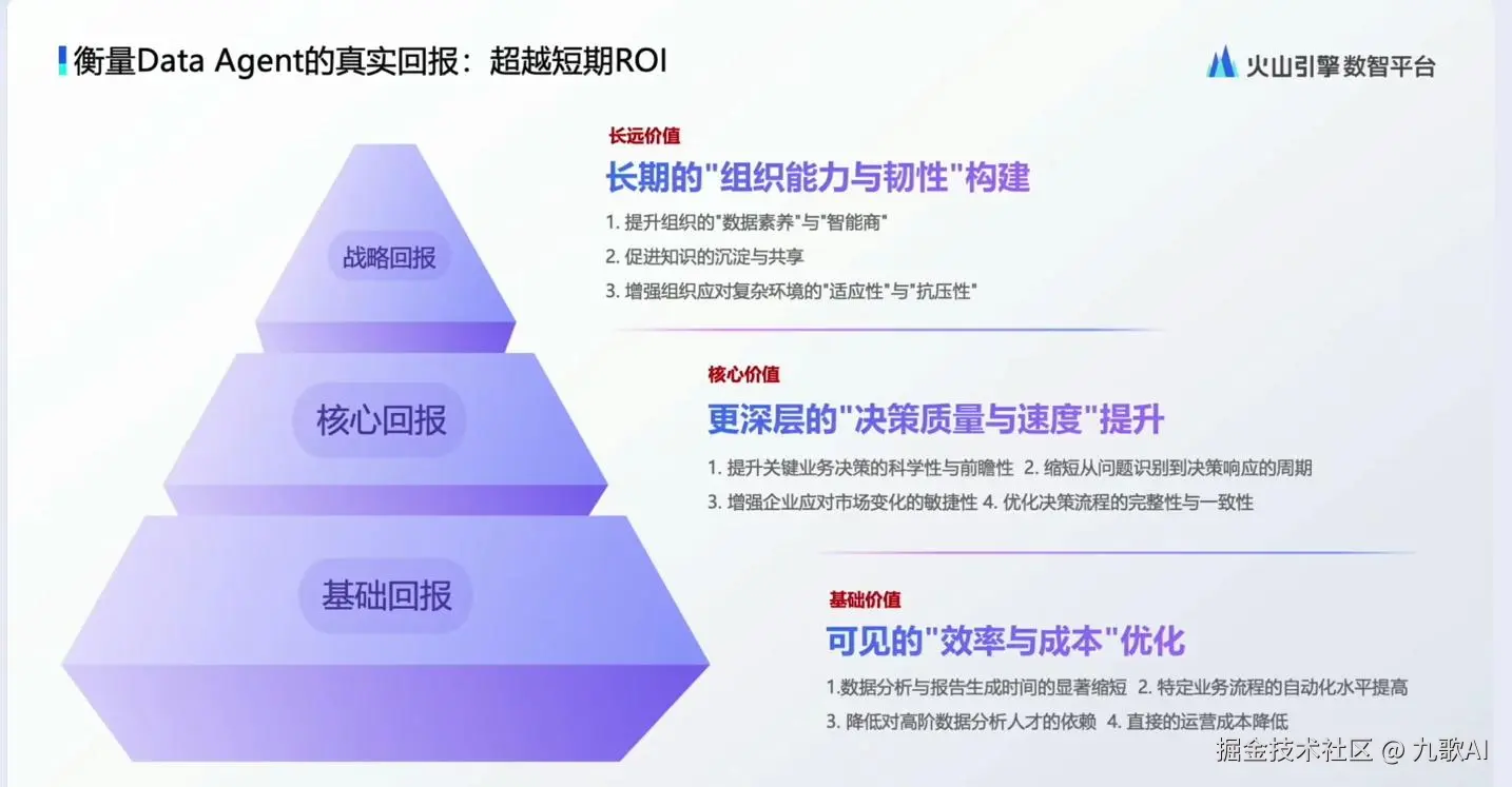 今天看了火山引擎Data Agent相关的直播,觉得受益匪浅,特别是第一个项目负责人海书山的发言,适合多次回味,大厂的同志对智能体的认知,就是有深度,不得不服。完整直播回放请直接视频号观看。
