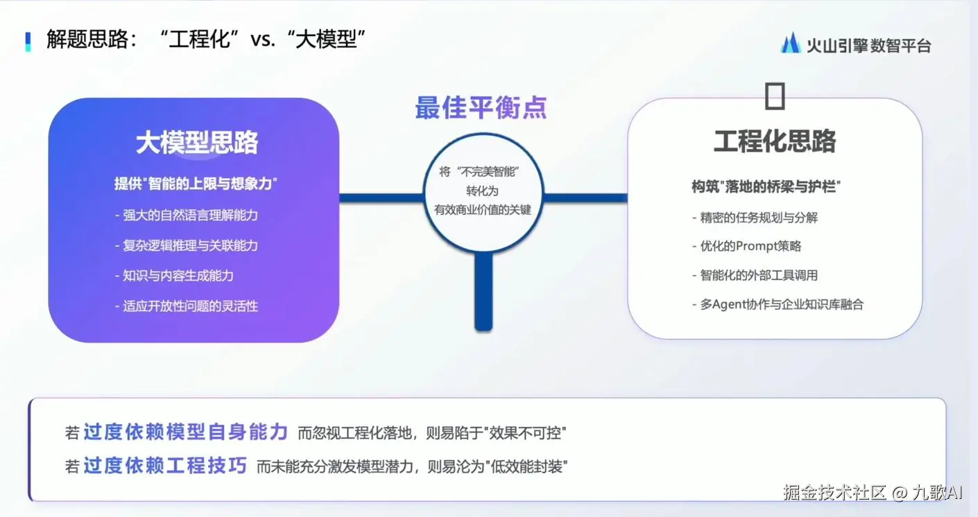 通过结构化的提示词和细致规划的工作流,借助外部工具的使用,降低大模型的幻觉,提供智能体过程的可控性,从而保证结果的稳定性和准确性。工程化思路侧重于通过任务分解、固定策略的prompt、调用外部工具或结合知识库和数据库,提升业务场景落地的下限,搭建大模型与业务场景间的桥梁。