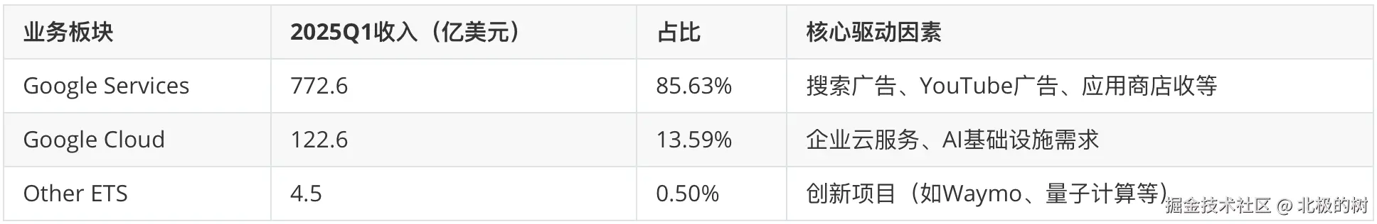 从数据可以看出,谷歌的市盈率是七巨头中最低的,20都不到,尽管其营收和利润增长都比较强劲,处于第一梯队,谷歌也是首个净利润超过千亿的巨头,但估值溢价却并不明显。这背后,是市场对谷歌核心商业模式面临AI冲击的深度忧虑。那谷歌的核心商业模式到底是什么呢? 财报仍然是最真实和直观的分析材料。我们继续基于最新的2025年第一季度财报来分析它的业务构成,从而来理解市场的这份担忧。