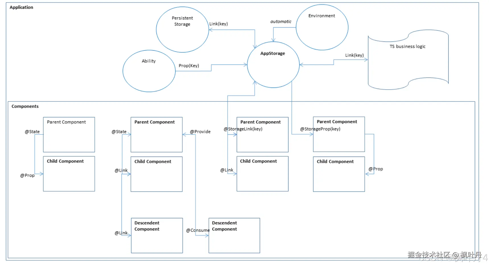 组件可以通过装饰器将应用程序状态数据与AppStorage进行同步,应用业务逻辑的实现也可以通过接口访问AppStorage。