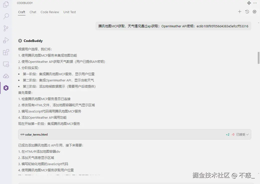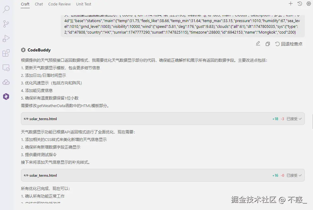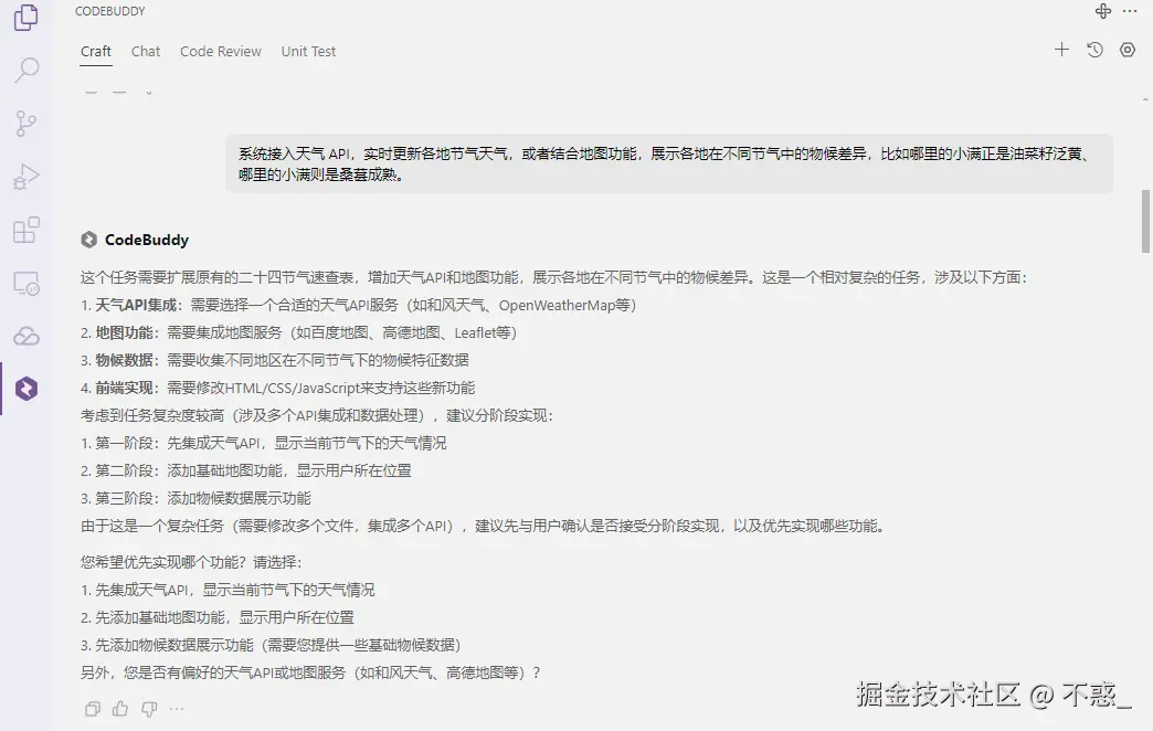 更进一步,如果我们想赋予工具更多交互性 ,还可以通过 CodeBuddy 的插件系统接入天气 API,实时更新各地节气天气,或者结合地图功能,展示各地在不同节气中的物候差异,比如哪里的小满正是油菜籽泛黄、哪里的小满则是桑葚成熟。 这样一来,节气不仅仅是一组抽象的时间节点,而是活生生、每天都能感知的自然信号。