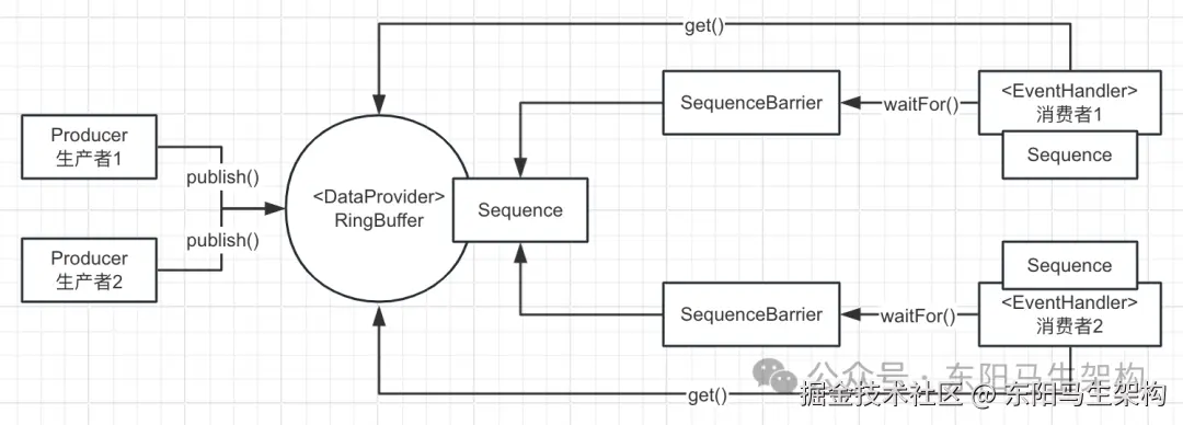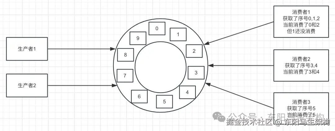注意三: 使用多消费者模式时,每个消费者需要一个Sequence来标记当前消费的最小序号。这样生产者投递消息时才能遍历消费者的Sequence找出最小的序号,然后写到最小的序号位置进行阻塞等待。