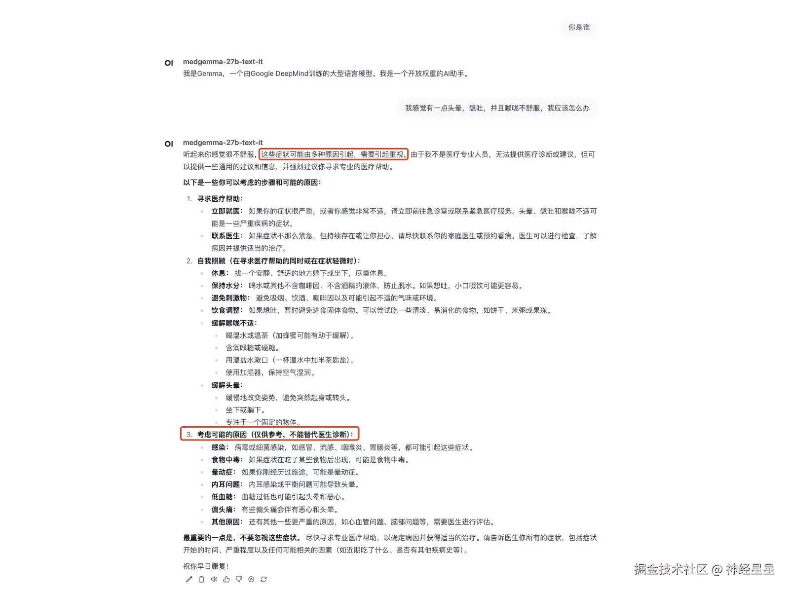 笔者描述的症状为:「我感觉有一点头晕,想吐,并且喉咙不舒服,我应该怎么办」,可以看到 MedGemma 不仅给出了「立即就医」与「自我照顾」的不同解决办法,同时还提供了可能引发这一系列症状的病因。