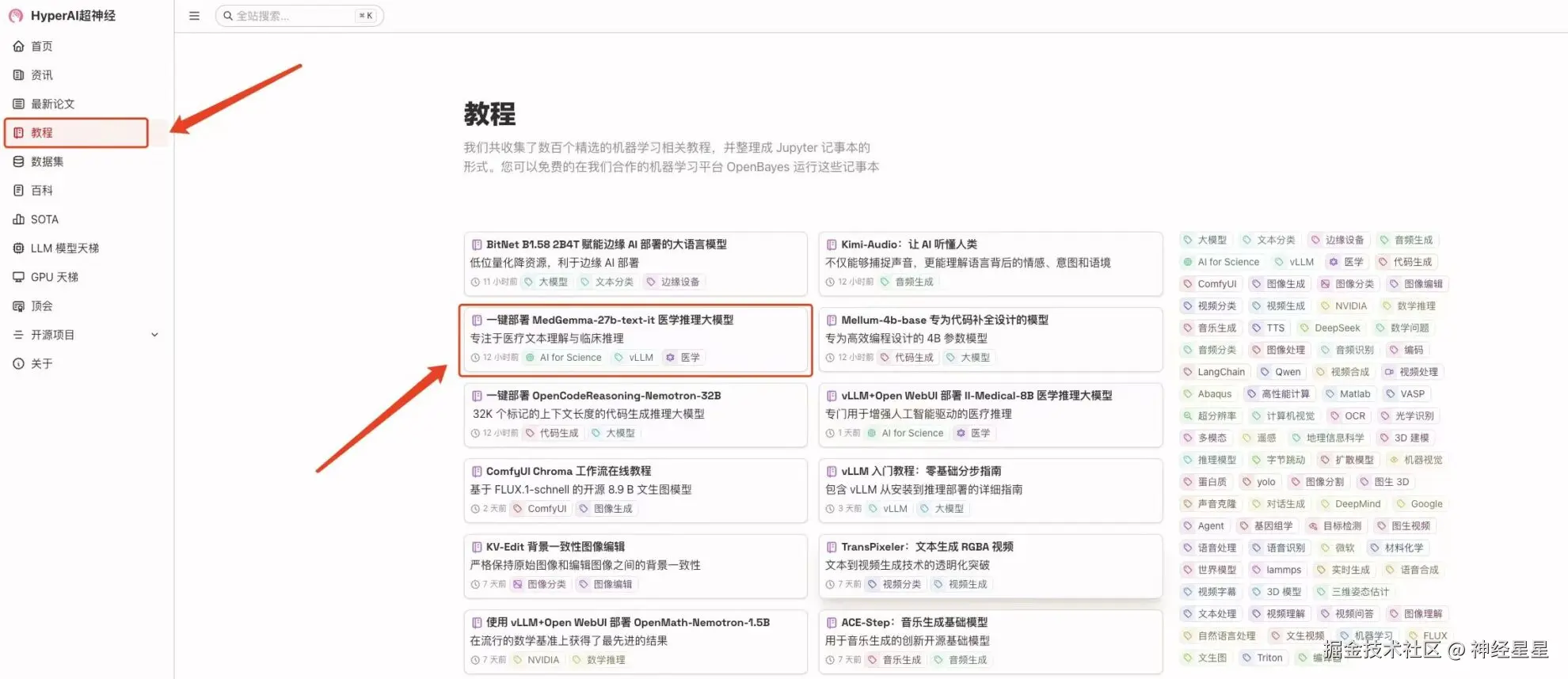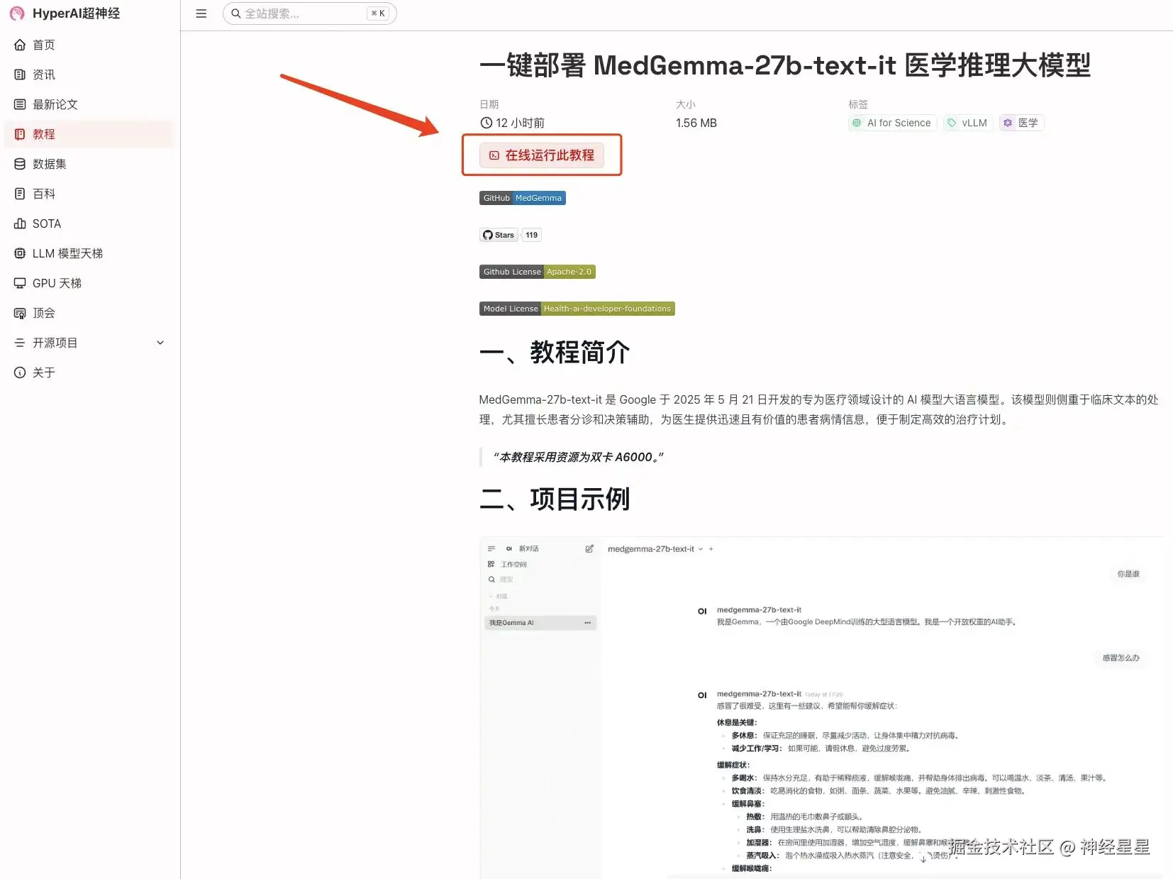 - 进入 hyper.ai 首页后,选择「教程」页面,并选择「一键部署 MedGemma-27b-text-it 医学推理大模型」,点击「在线运行此教程」。