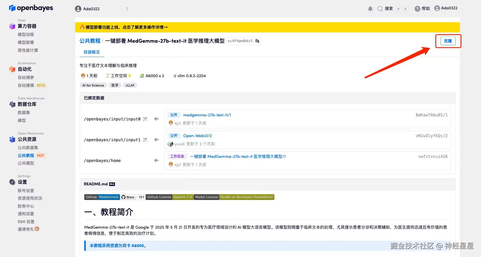 此外,官网的教程版块还上线了「vLLM+Open WebUI 部署 II-Medical-8B 医学推理大模型」, 该模型基于 Qwen3-8B,通过使用特定于医疗领域的推理数据集进行监督微调,并在硬推理数据集上训练 DAPO(一种可能的优化方法)来优化模型性能。