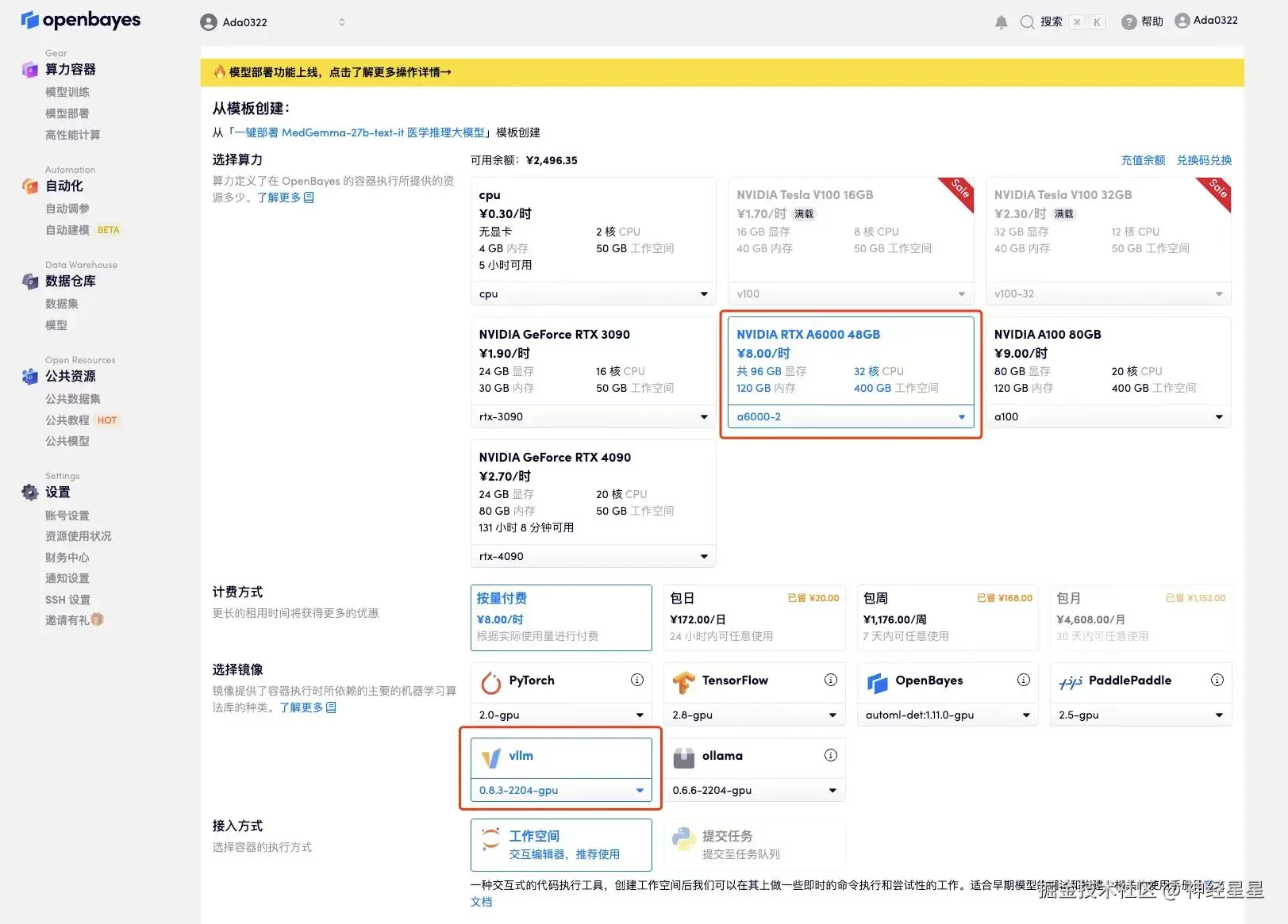 - 选择「NVIDIA A6000 48GB」以及「vLLM」镜像,OpenBayes 平台提供了 4 种计费方式,大家可以按照需求选择「按量付费」或「包日/周/月」,点击「继续执行」。新用户使用下方邀请链接注册,可获得 4 小时 RTX 4090 + 5 小时 CPU 的免费时长!