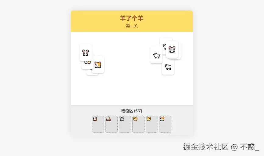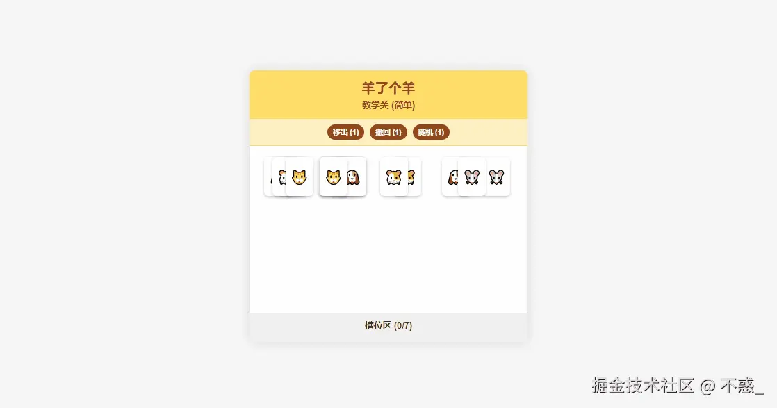 使用HTML和JS开发羊了个羊 核心功能需求 基础玩法 消除机制:用户点击卡牌放入槽位,3张相同卡牌消除,槽位满则失败。 关卡设计: 极难的第二关(通关率<1%),搭配“地区排行榜”刺激挑战欲。 第一关作为简单教学关(通关率>90%)。 道具系统: 移出道具:移除前3张卡牌。 撤回道具:回退上一步操作。 随机道具:随机消除槽位内1张卡牌。 社交与竞争 地区排名:按用户IP自动归属地区,显示实时通关人数排名。 分享复活:失败后需分享到微信群/朋友圈获得复活机会。