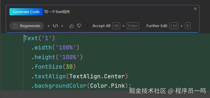 比如输入“写一个Text组件”,它就会在鼠标的光标之处,立马生成一个Text组件,你可以点击Accept All选项进行同意,或者Alt+Enter快捷键同意(需要看你IDE配置的快捷键,根据配置不同,快捷键也不同),当然了,你也可以继续编辑或者,点击叉号进行关闭。