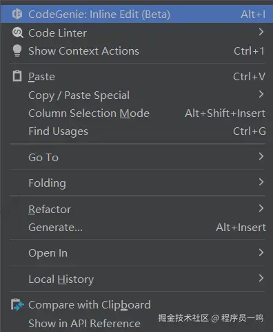 这个就厉害了,你可以在任意的代码编辑区域,点击右键,选择CodeGenie:Inline Edit,或者执行快捷键,Alt+I(需要看你IDE配置的快捷键,根据配置不同,快捷键也不同,Mac是option+I)。