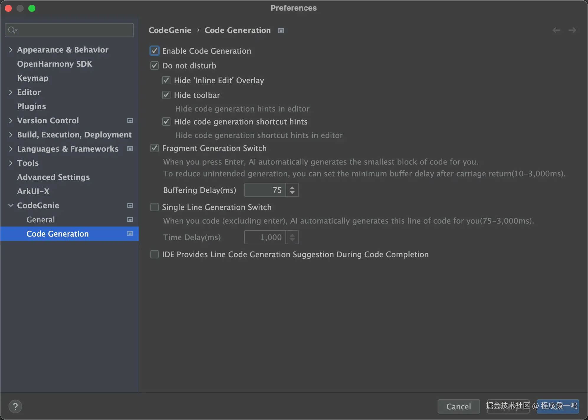 这个就更厉害了,你可以在之前的代码上进行代码续写,前提,需要进入File > Settings >DevEco CodeGenie > Code Generation页面开启。