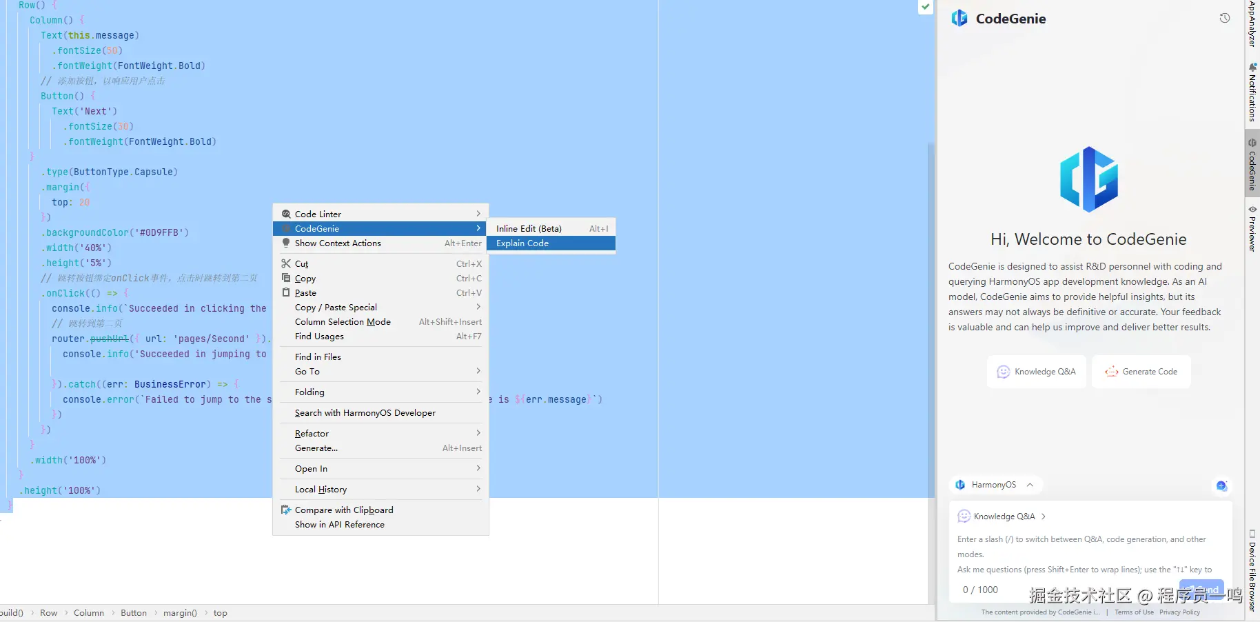 上篇文章,我们遗留了CodeGenie工具的三个功能点,分别是代码生成和编译报错智能解析,以及代码智能解读,这篇文章,我们就着重了解一下,最后,还是希望大家能够在DevEcoStudio亲自体验,相对来说,更能加深对此工具的印象。