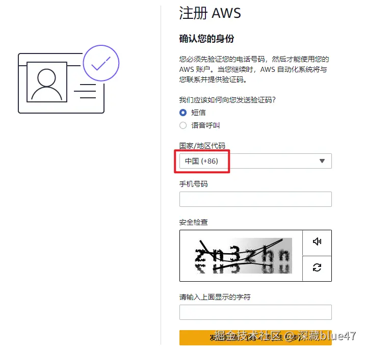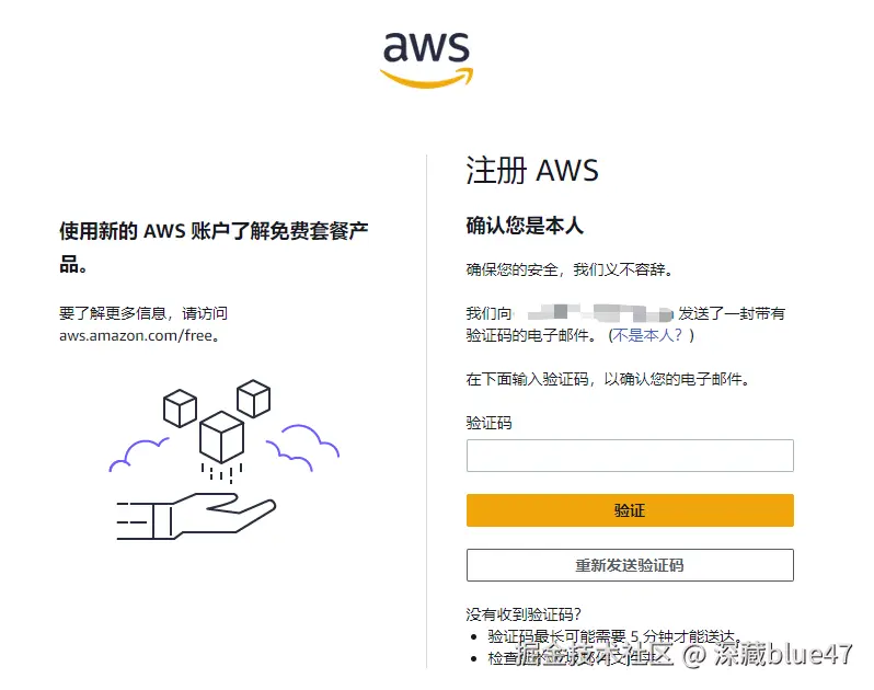 邮箱验证码验证 填入 AWS 发送的验证码,完成邮箱验证。