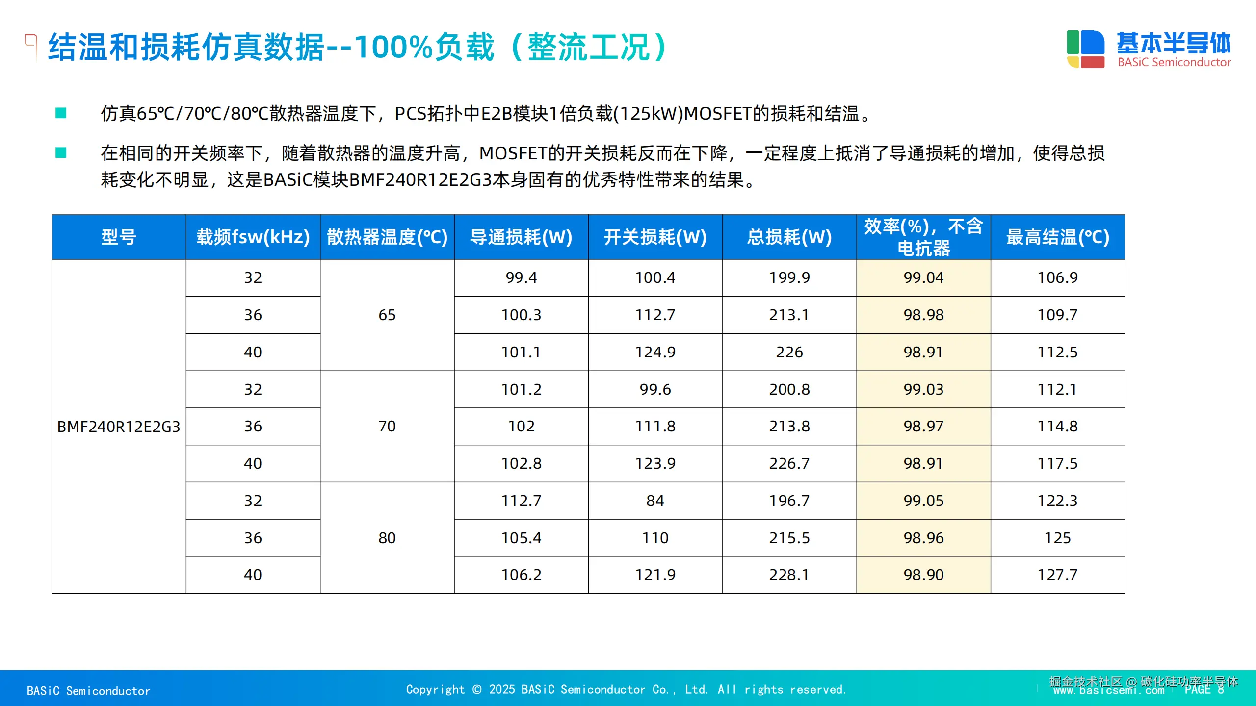 基本半导体的BMF240R12E2G3模块采用1200V/240A半桥设计,开关频率可达40kHz以上,显著降低开关损耗(较IGBT减少70%-80%),使PCS整机效率突破98.5%。例如,在125kW储能系统中,SiC模块通过减少电感、电容等无源器件体积50%,功率密度提升25%,适配工商业场景对紧凑部署的需求。