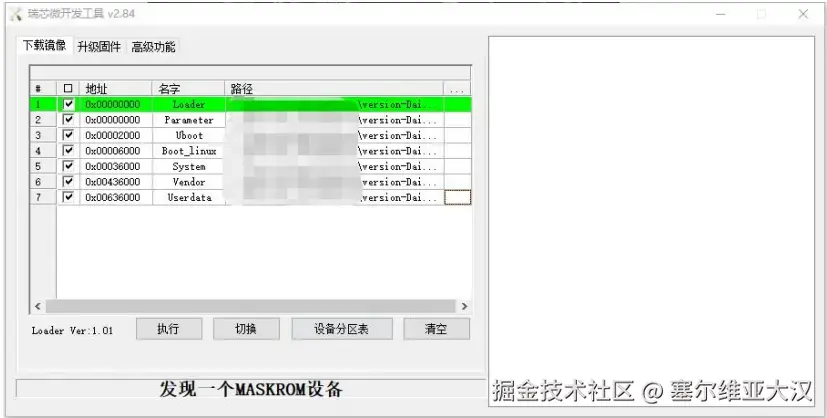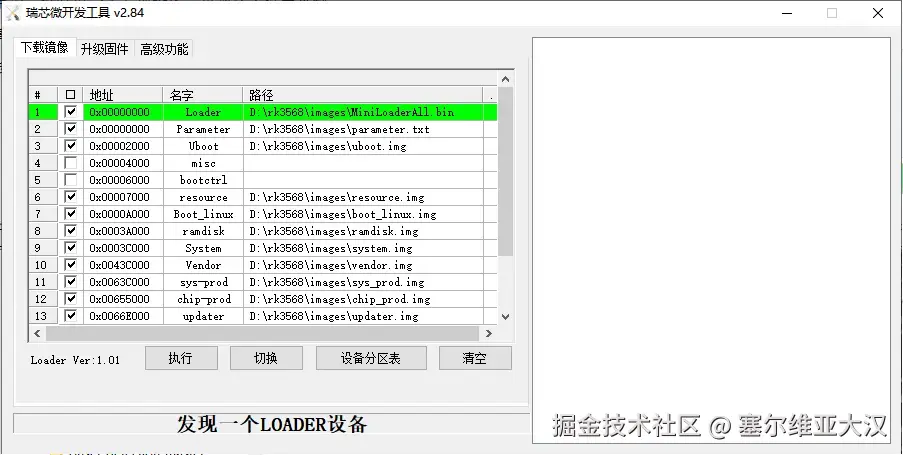 - 开发板现在处于开机状态,双击 windows\RKDevTool.exe 打开烧录工具,按鼠标右键导入配置