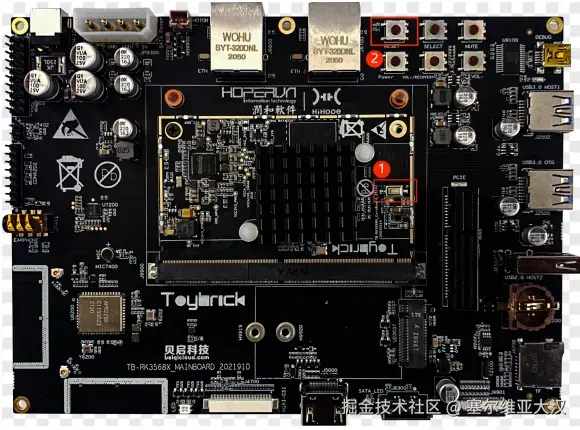 a. 按住白色按钮 Maskrom 按键(图中标注的 ① 号键)和 RESET 按钮(图中标注的 ② 号键)不松开,烧录工具此时显示“没有发现设备”;
