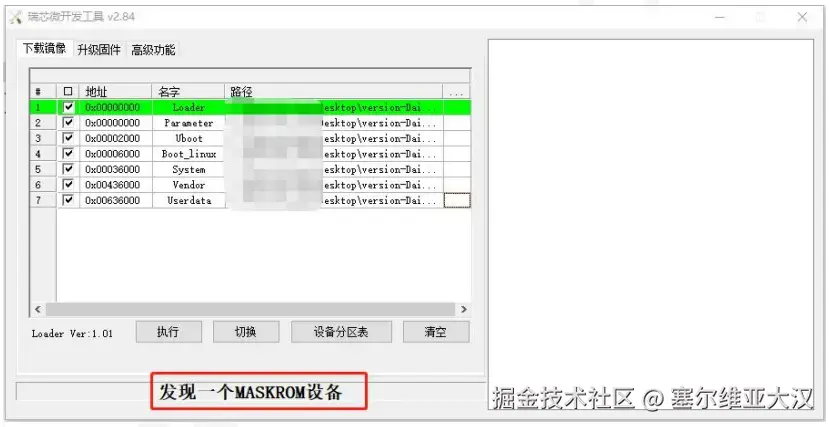 如果界面显示"发现一个 MASKROM 设备", 说明开发板进入 Maskrom 模式等待烧录固件。