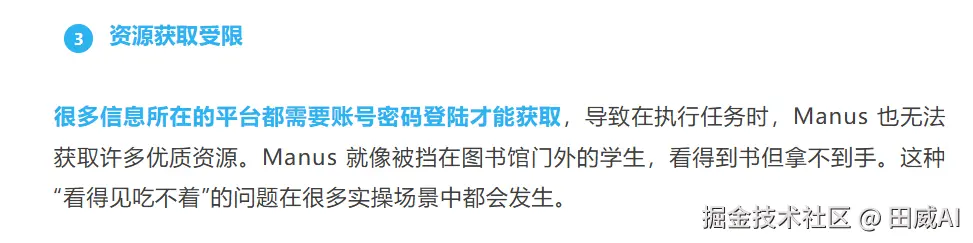 比如我在科普中国上面关于Manus的这篇约稿中,有一段是关于Manus无法获取互联网上的优质资源,但是我不知道该用什么比喻来形容,就让Claude帮忙写了一下,然后AI就将Manus比喻成了一个在图书馆门外的学生,看得到书,但是拿不到书。这个比喻非常的精妙,是我自己想不到的。