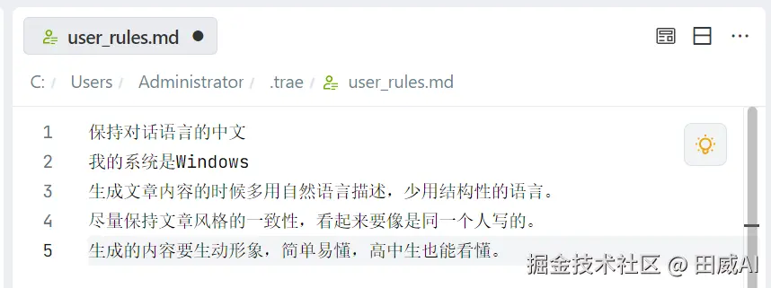 像全局规则,我会在Trae里面提前设置好,防止在写作时出现问题,因为我大部分设置都放在智能体里面了,所以这块会比较简单。