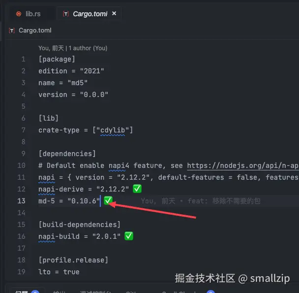 找到根目录的Cargo.toml文件,需要添加一个md5依赖,在dependencies下面添加md-5 = "0.10.6"