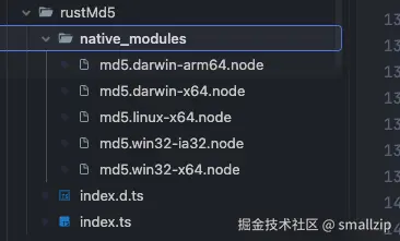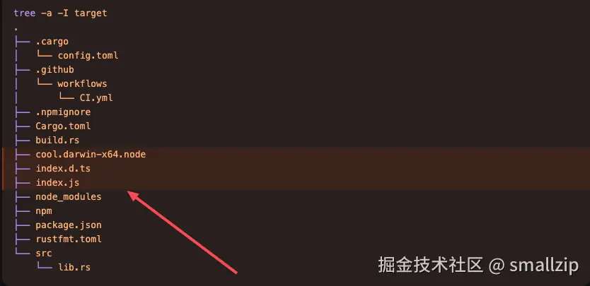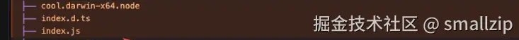 cool.darwin-x64.node 是 Node.js addon 二进制文件, index.js 自动生成的 JavaScript 绑定文件,它帮你从 addon 二进制中 export 出所有的东西,并且保证对 esm 与 CommonJS 的兼容。index.d.ts 是生成的 TypeScript 定义文件。