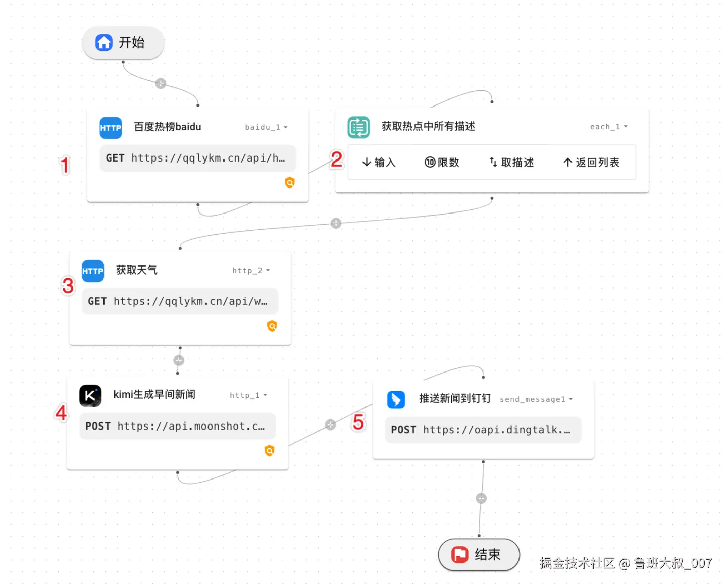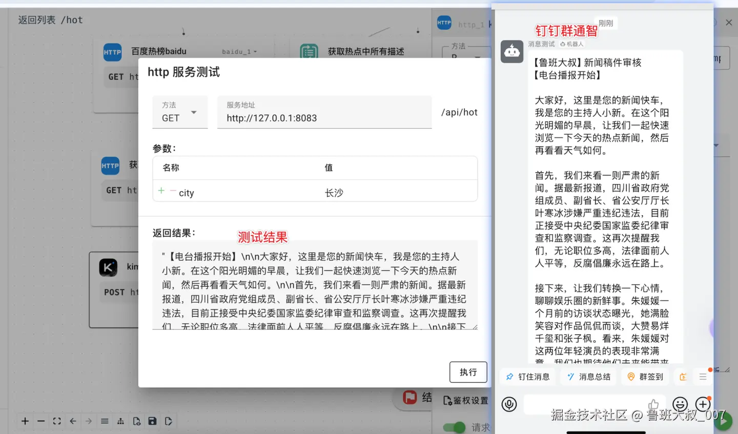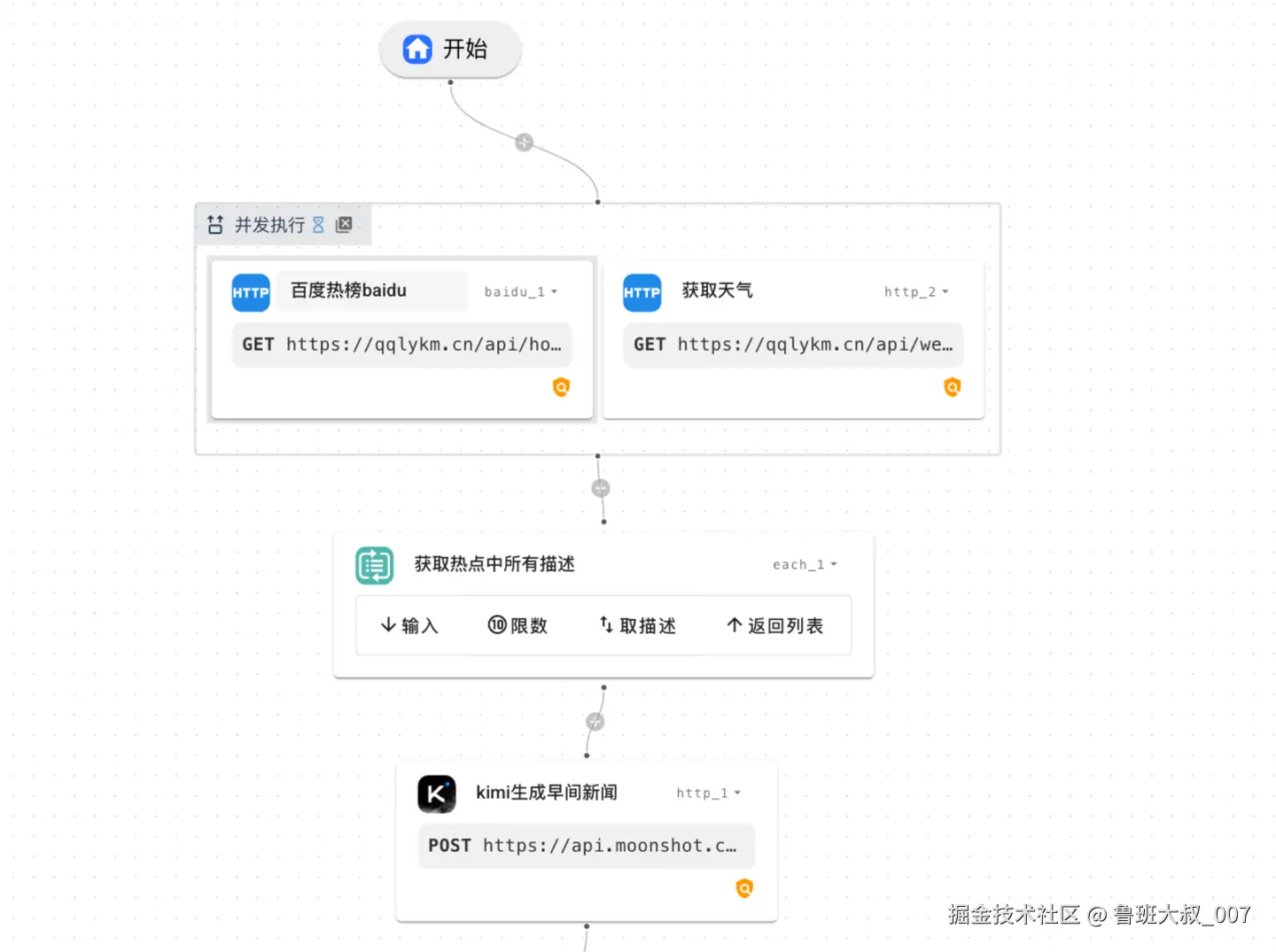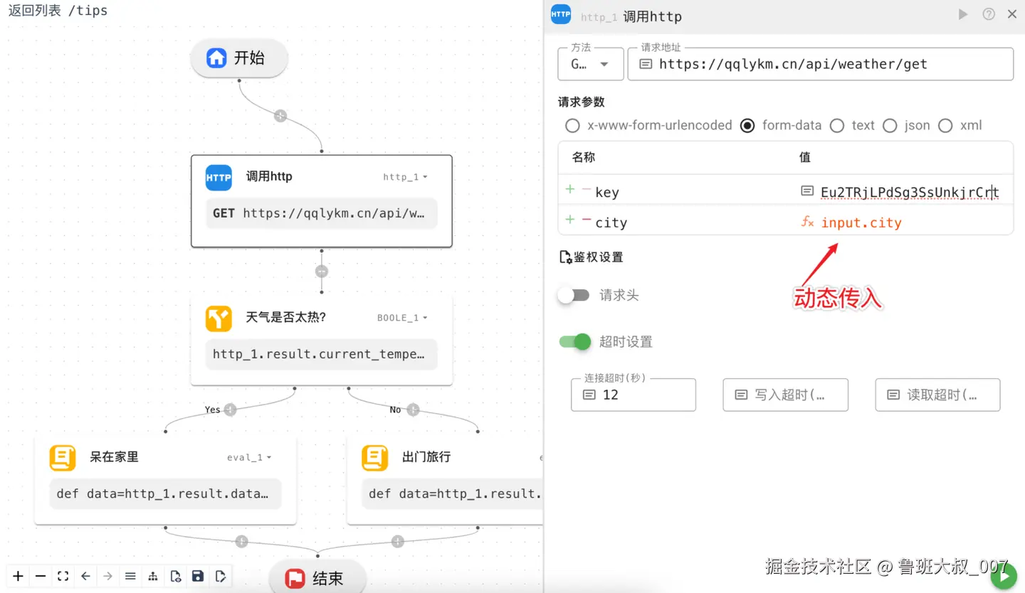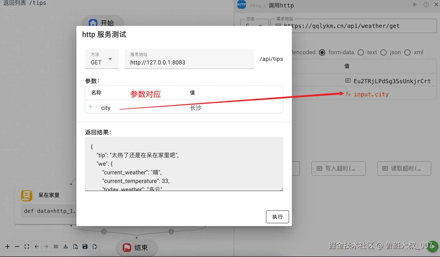 这里关键是http节点的编辑,其有一个city城市参数是外部传入的,所以用input.city 表达示.