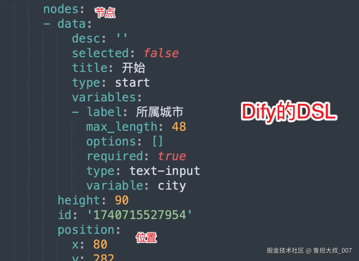 下图是Dify的示例采用yaml结构,同样存储节点、边线、以及逻辑参数: