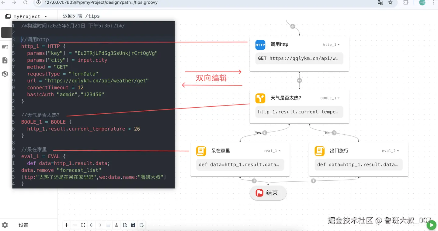 要做到双向编辑,DSL设计是关键,这里DSL设计是基于Groovy实现,灵感来源于java构建工具Gradle。这种dsl是简化后的Groovy代码 所以是可以直接编辑的,此外主体结构进行规范化限制 不会像纯脚本代码一样的显的很乱。后面还可以加上像ide一样的语法错误提示、快捷提示等语法服务,编辑体验将进一步提升。